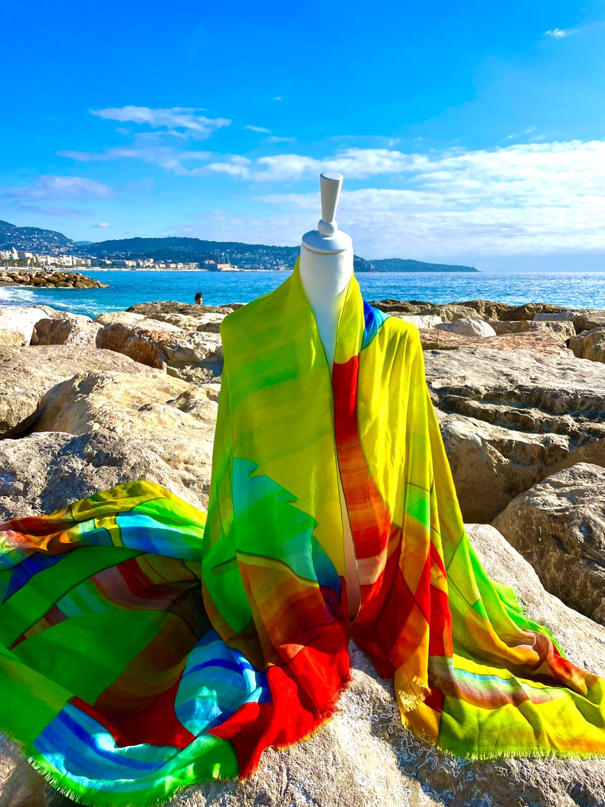 Abstract color fantasy. Another cashmere and silk design by the same artist in florence, italy depicting his thoughts on spring - vibrant colors emerge and this piece provides a fabulously cheerful accessory to brighten up any winter outfit - while awaiting the arrival of spring! Price $95 - size 70" x 70" - all pieces are exclusive to couture cashmere
