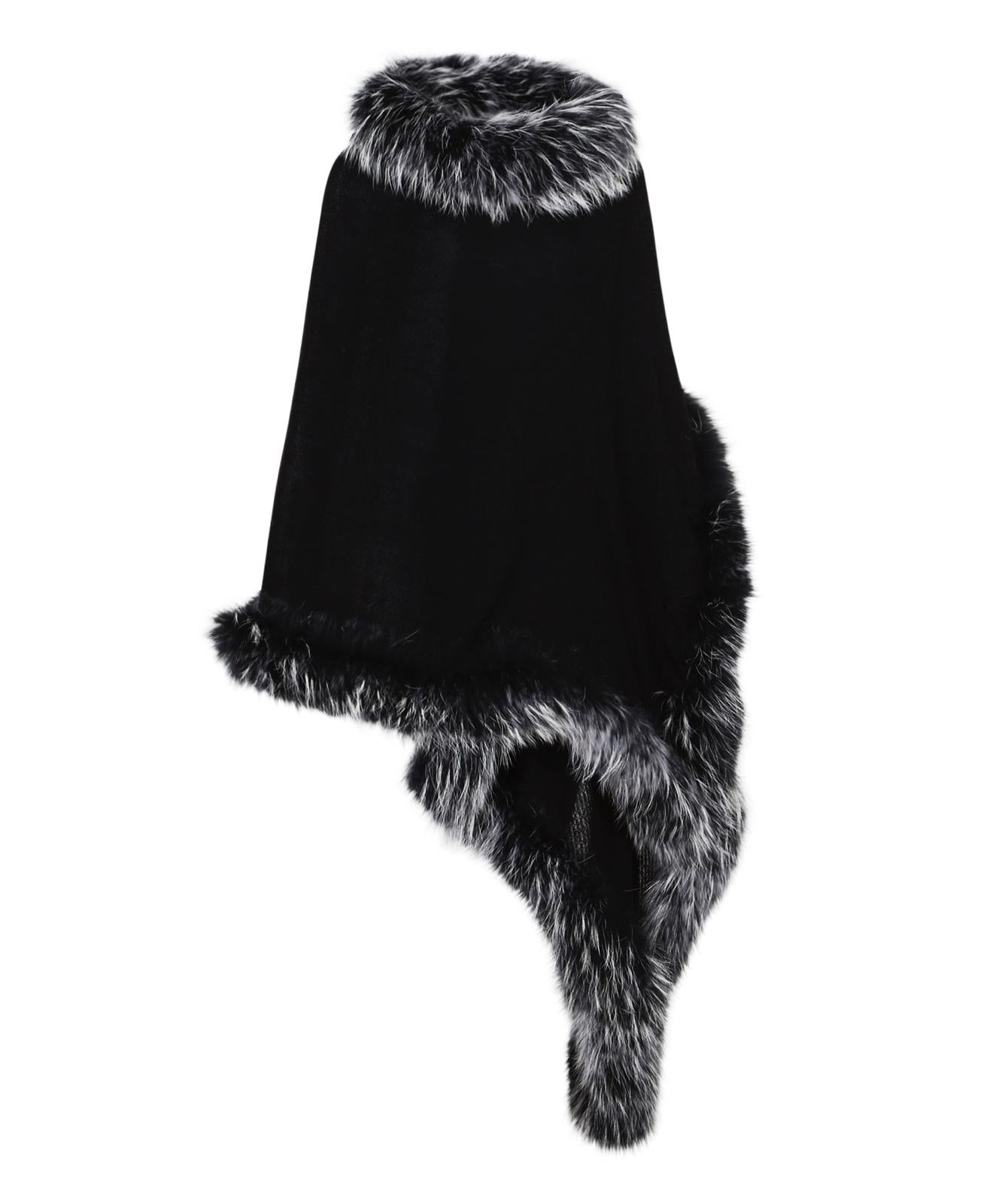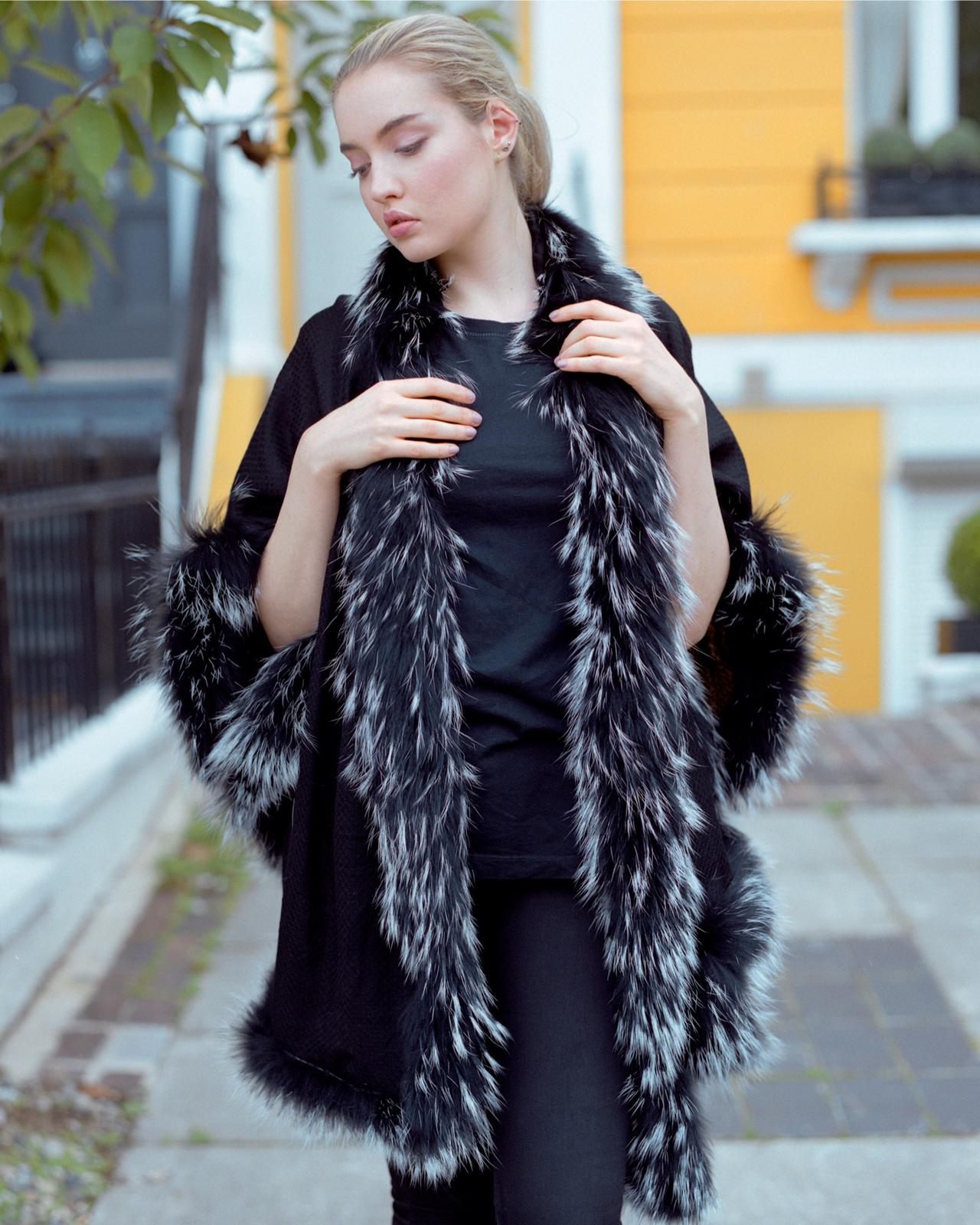 Black Cashmere Wrap with Black and White Fox Fur Trim