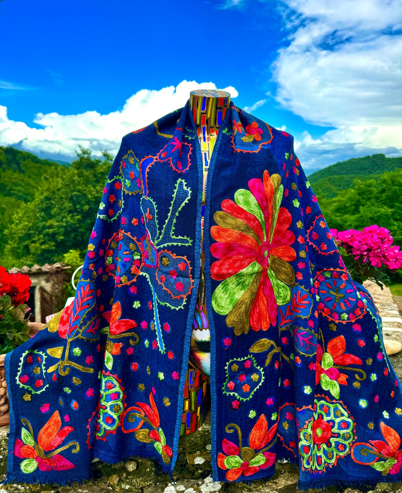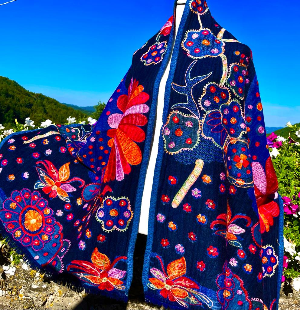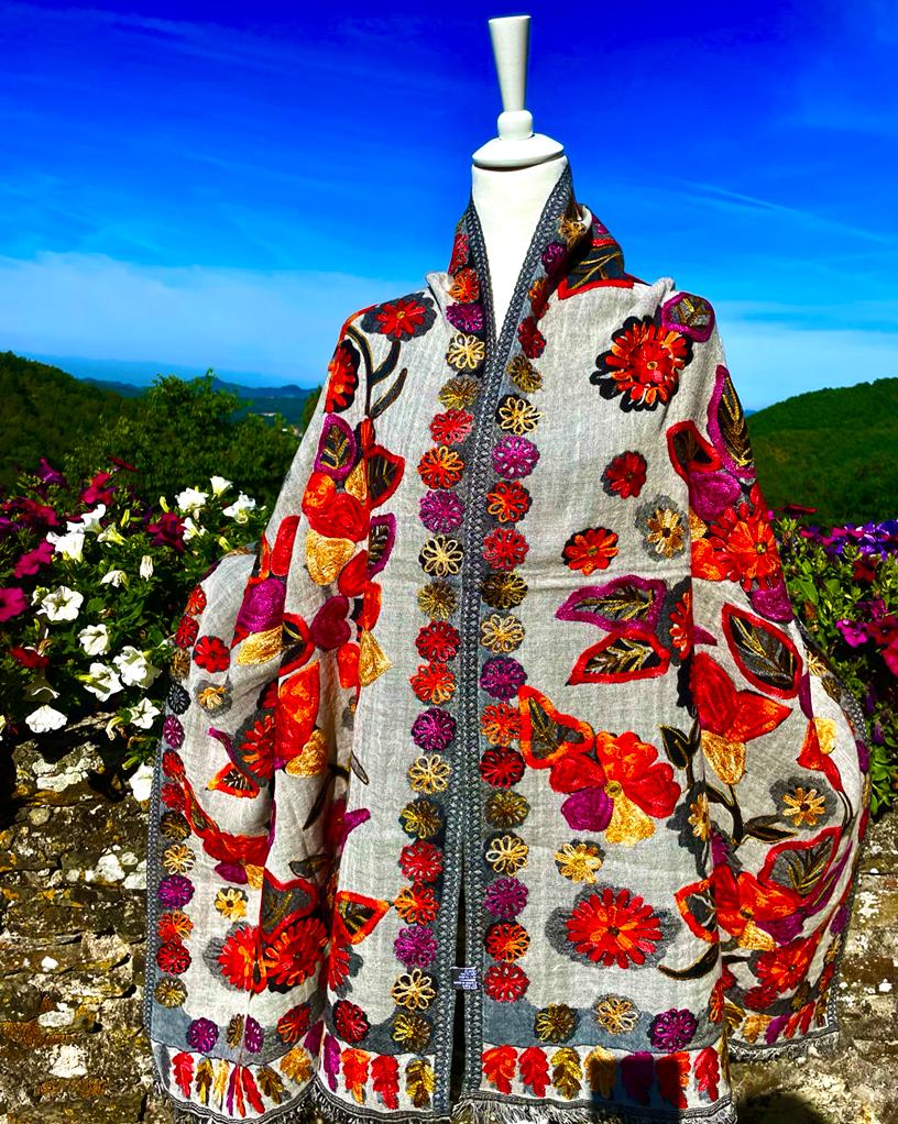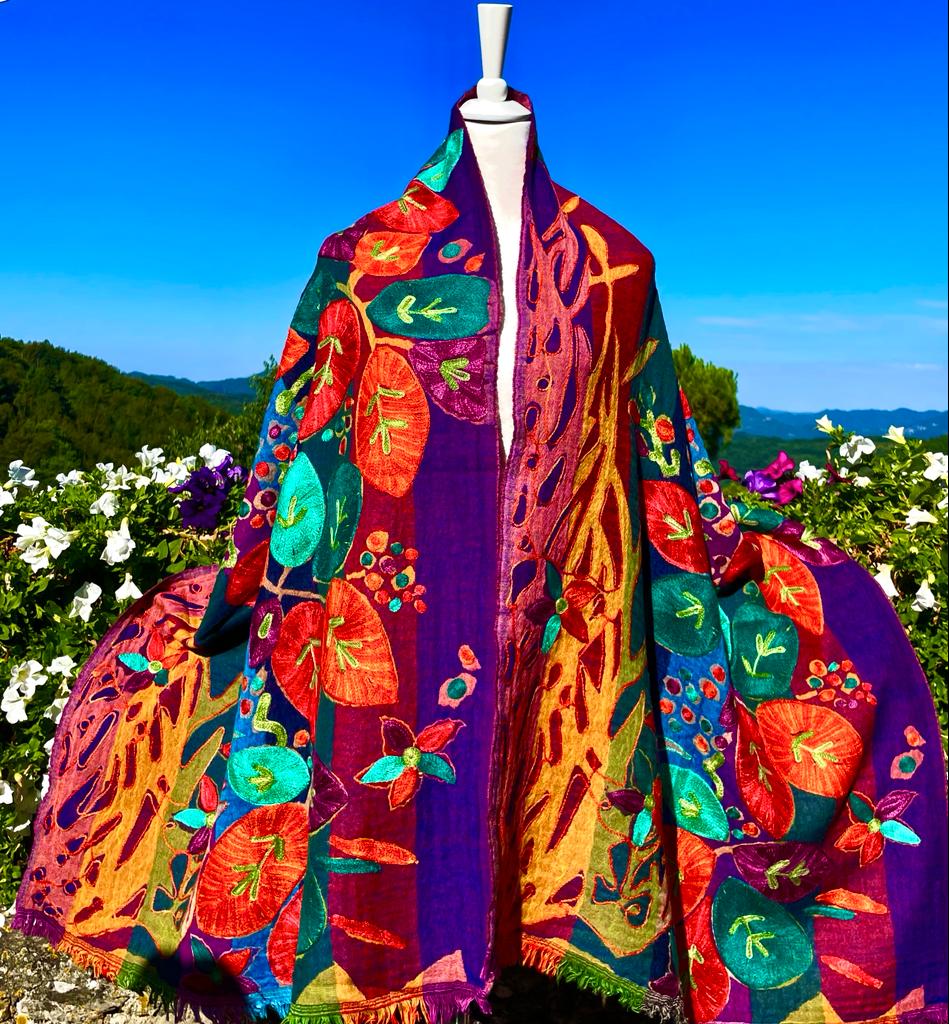 Hand stitched appliqué designs in pure silk and beautiful fabric from the artist who is carrying on the over 300 year family tradition of manufacturing textiles such as wool, cashmere and silk in Lucca, Italy.