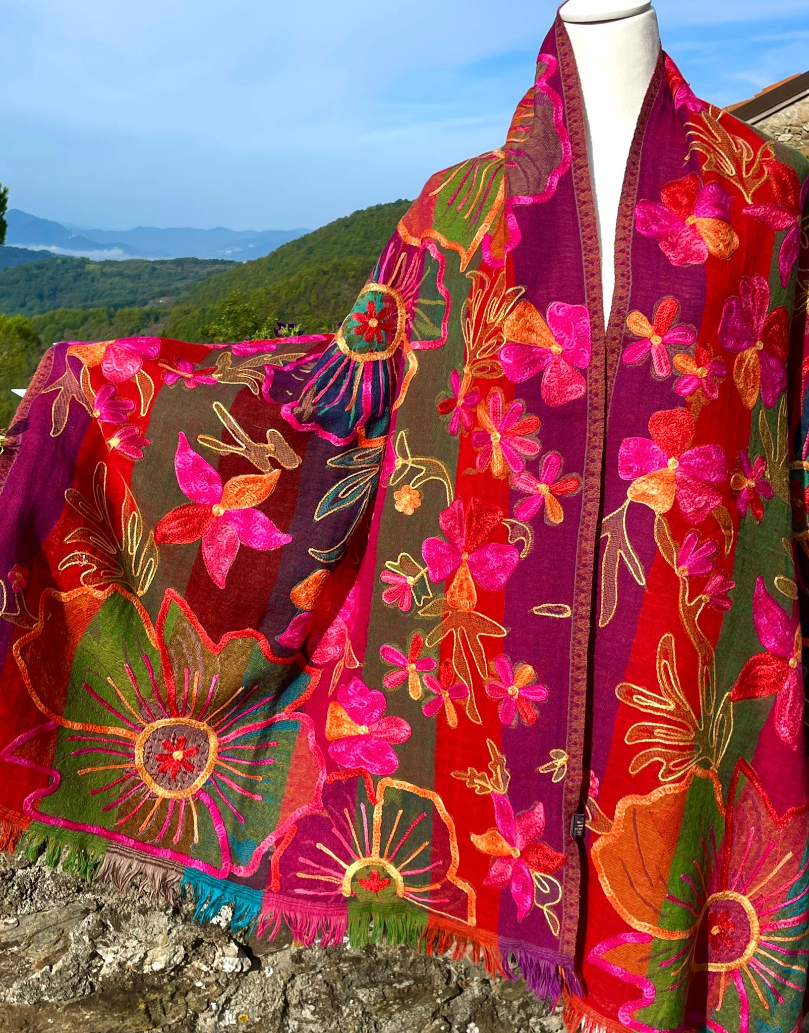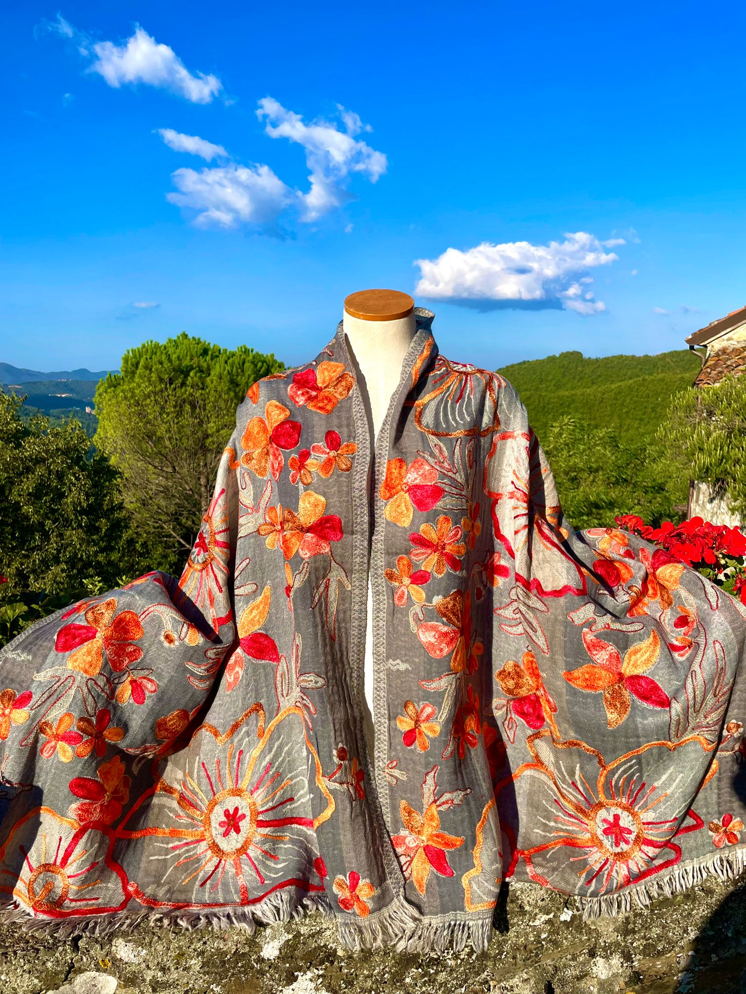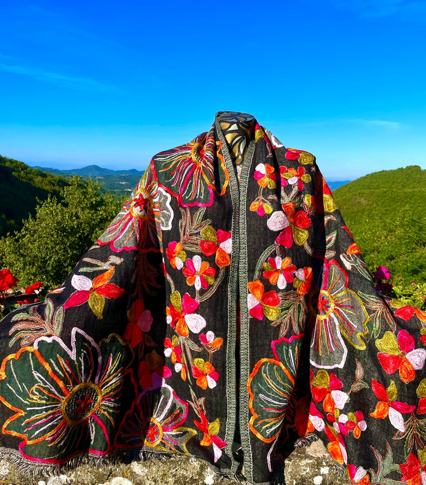 Hand stitched appliqué designs in pure silk and beautiful fabric from the artist who is carrying on the over 300 year family tradition of manufacturing textiles such as wool, cashmere and silk in Lucca, Italy.