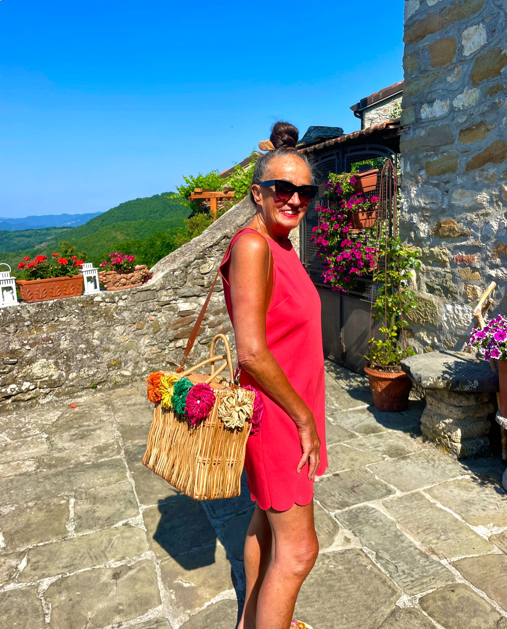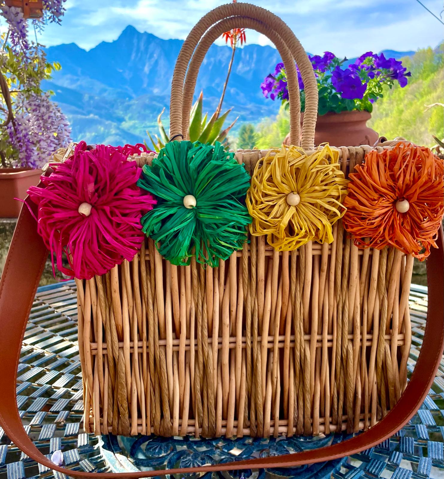 Beautifully designed and hand made real bamboo rattan bags with hand appliqué flowers. All made in Italy. This one boasts a cotton lining with zippered closing and has a fabulous detachable real leather shoulder strap as well as sturdy bamboo carry handles. A great summer bag sturdy and strong either for business or pleasure! Unique, fun, colorful and a great summer accessory.