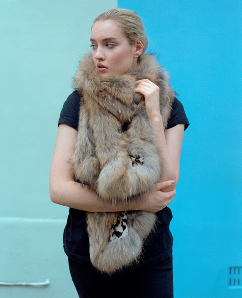 Luxuriously soft pure cashmere leopard shawl with real fox fur trim.