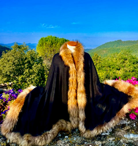 Solid Black Cashmere Shawl with Natural Brown Fox Fur Trim